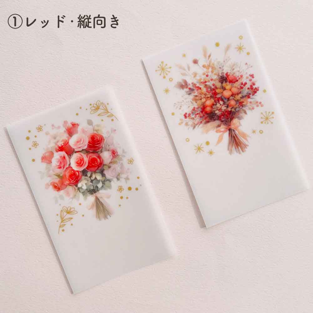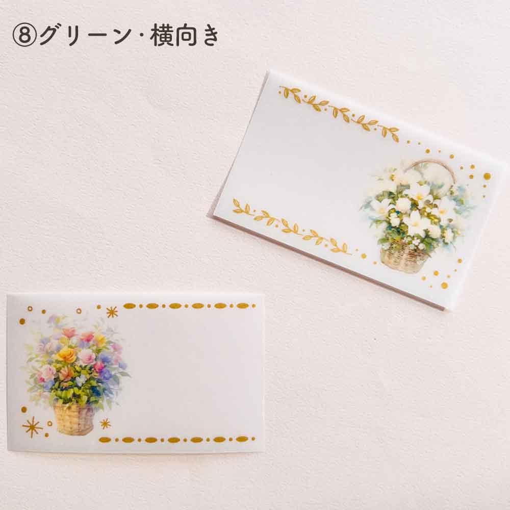 華やかな花束モチーフ4種類と、バスケットなどに入った生花風アレンジメントモチーフ4種類の全8柄。