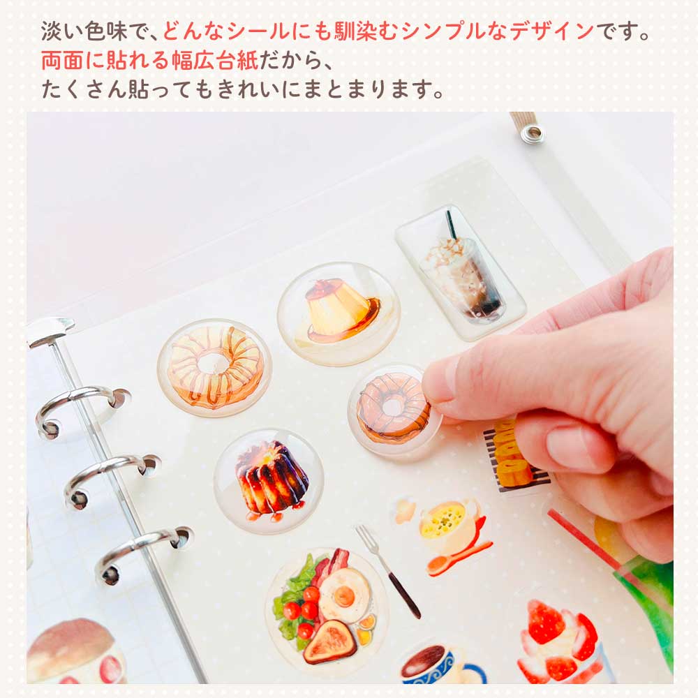 両面に貼れる幅広台紙は、淡い色味でどんなシールにも馴染むシンプルデザイン。